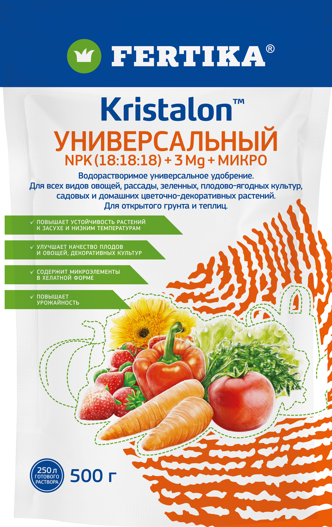 Комплексное бесхлорное гранулированное удобрение пролонгированного действия. Легкодоступный комплекс питательных элементов сформирован в гранулу, которая постепенно растворяется в почве, обеспечивая пролонгированное и равномерное питание растений.