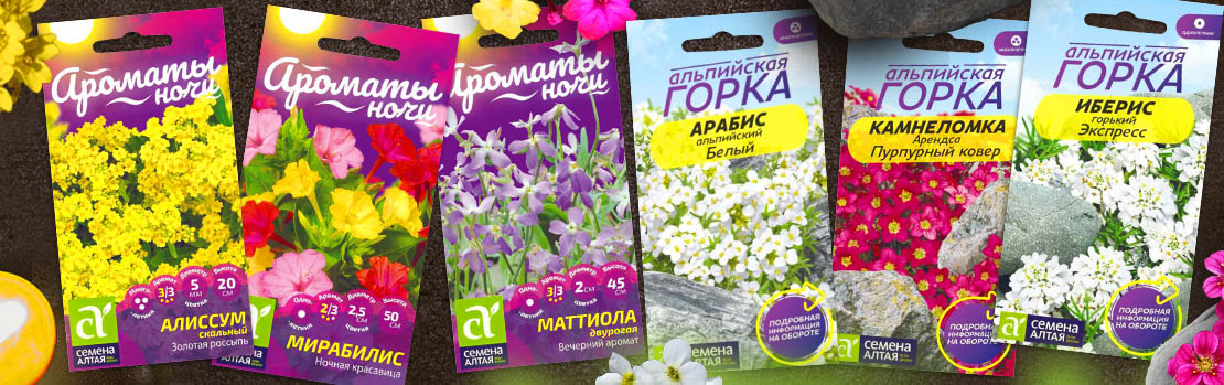 Неприхотливые декоративные растения, которые могут выращиваться на скудных почвах, на каменистых почвах, в засушливых условиях, мы собрали в серию «Альпийская горка». В этой серии представлены также семена суккулентов и почвопокровники. В серии «Ароматы ночи» представлены культуры, которые максимально раскрывают свой аромат в вечернее и ночное время: Алиссум, Мирабилис, Вечерница и другие.