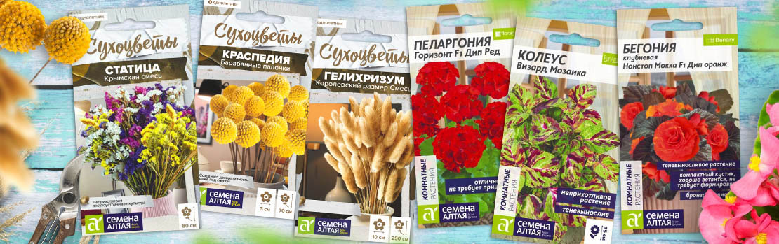 Для выращивания цветов в условиях квартиры в нашем ассортименте представлены серия «Комнатные растения», в нее вошли такие культуры, как Колеусы, Гипоэстесы, низкорослые Эустомы. Серия «Сухоцветы» включает в себя растения, которые отлично сохраняются в срезке в течение длительного времени, до нескольких лет