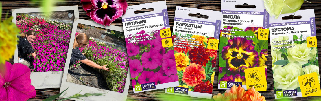Профессиональная серия семян цветов включает в себя высококлассные гибриды от ведущих мировых селекционеров. Растения максимально выравненные, обильо и продолжительно цветущие, устойчивые к заболеваниям и поражению вредителями. В серии представлены такие культуры как: Бархатцы Френч Дварф, Петунии Пендолино, Гарден бьюти, Дуо, Призма, Лавина, Вербена бонарская Апекс, высокорослые Эустомы АВС и Мариачи, Шалфей