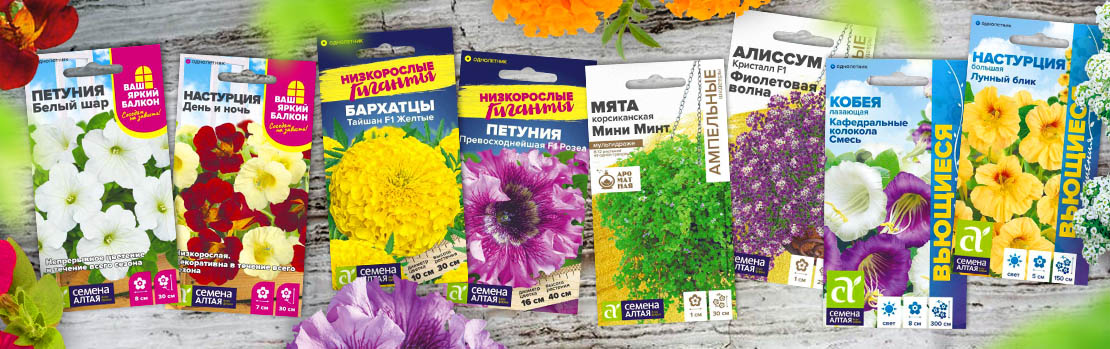 Серия «Ваш яркий балкон» с легкостью поможет решить вопрос, если у вас нет сада, эти растения предназначены для выращивания в маленьком объеме грунта. С серией «Низкорослые гиганты» (Бархатцы Тайшан, Петуния Превосходнейшая) получится оригинальная клумба. Создаст цветочные водопады в саду серия «Ампельные шедевры» (Мята Мини минт, Алиссум Кристалл, Дихондра Серебряный водопад, Лобелия Ривьера в разных окрасках, Петуния Джоконда). Мечтаете о живой изгороди? Скрыть недостатки дачных построек, украсить забор и стены легко с серией «Вьющиеся растения»
