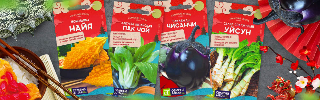 Серия «Азиатский огород» включает в себя экзотические культуры (Момордику, Кивано), а также сортотипы традиционных культур, характерные для выращивания в азиатских странах и используемые в азиатской кухне (капуста пекинская и капуста китайская Пак Чой, Ши Хо, салат спаржевый, вигна, дайкон, баклажан Чисанчи, перец Китайские фонарики).